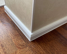 Особенности монтажа: для плинтуса Дёллькен из ХДФ существует возможность оформить наружный угол без разрыва облицовочной пленки. Для этого вам понадобится гильотина, с помощью которой оформляется внутренний угол, наружный, стык и заглушки для плинтуса. Далее Дёллькен просто крепится к стене на жидкие гвозди или термопистолет. Гильотину можно взять под залог в нашем розничном магазине.
